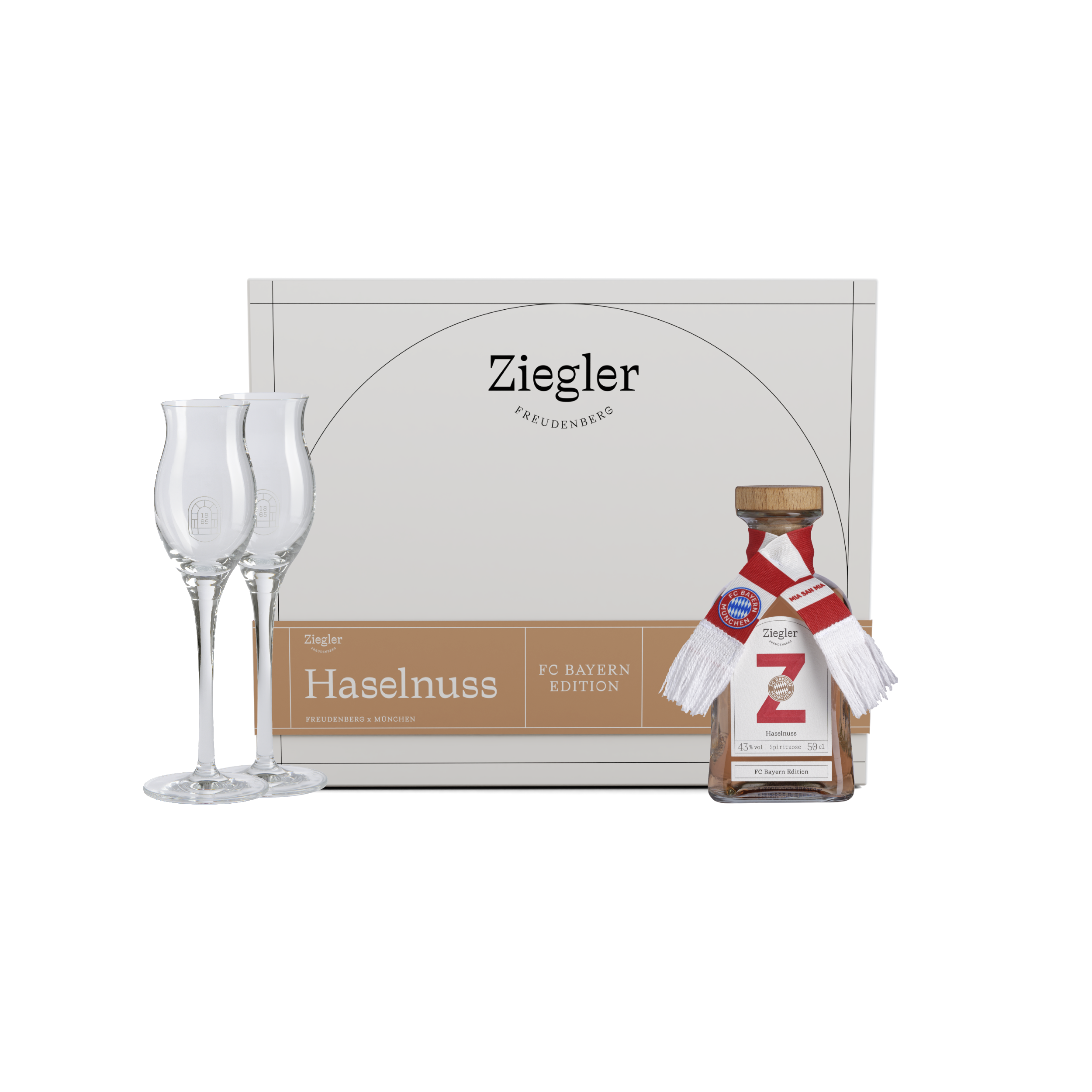 Experience distillation craftsmanship at the highest level. The hazelnut spirit is presented in the exclusive Ziegler x FC Bayern gift packaging. Two elegant tulip-shaped digestif glasses enhance the development of aromas and ensure a perfectly balanced tasting experience.