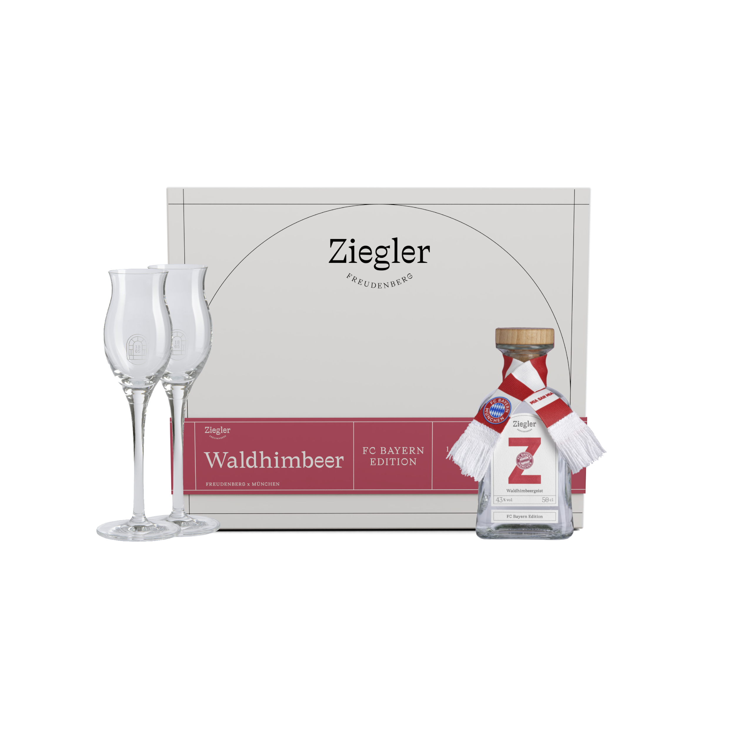 Experience distillation craftsmanship at the highest level. The forest raspberry spirit is presented in the exclusive Ziegler x FC Bayern gift packaging. Two elegant tulip-shaped digestif glasses enhance the development of aromas and ensure a perfectly balanced tasting experience.