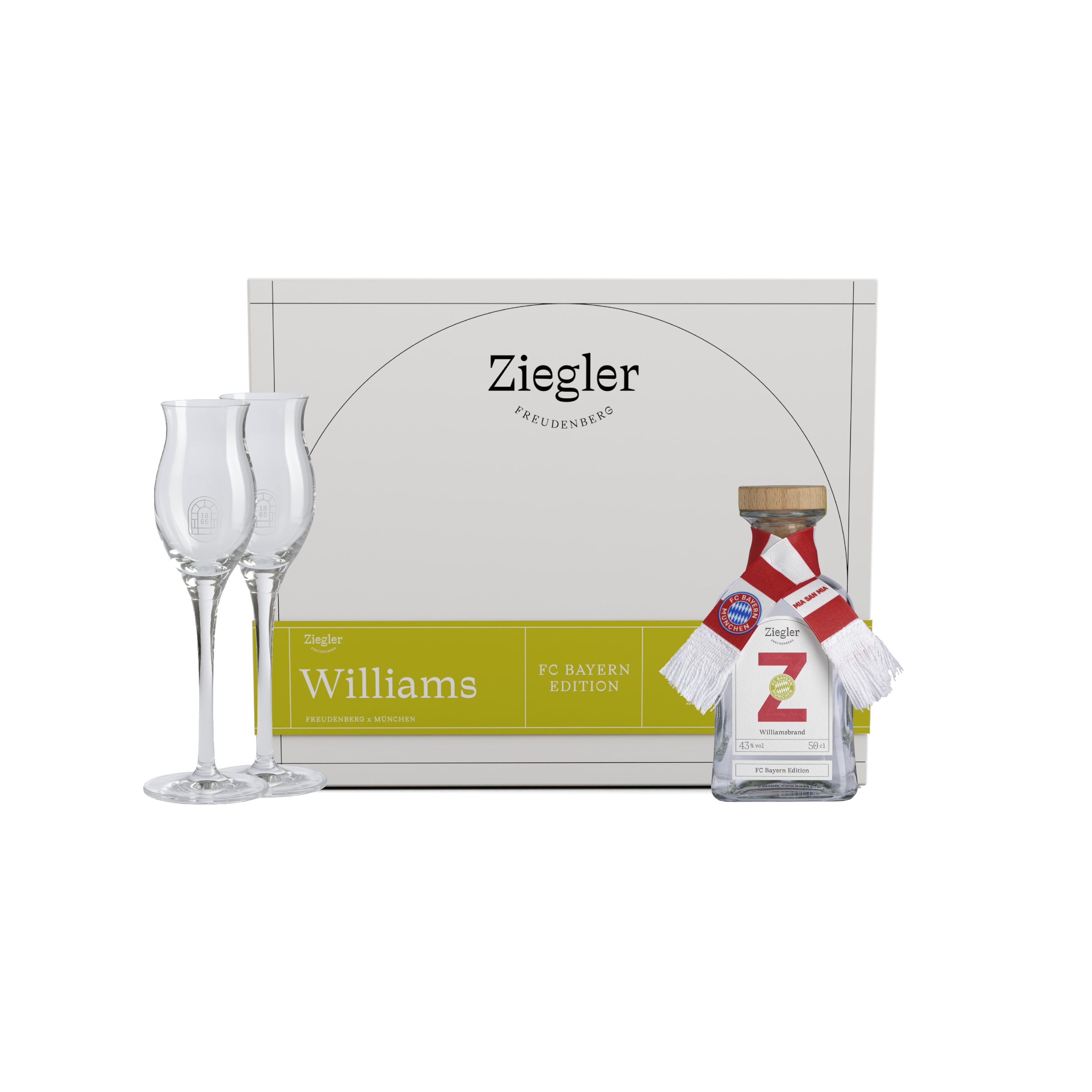 Experience distillation craftsmanship at the highest level. The Williams pear spirit is presented in the exclusive Ziegler x FC Bayern gift packaging. Two elegant tulip-shaped digestif glasses enhance the development of aromas and ensure a perfectly balanced tasting experience.