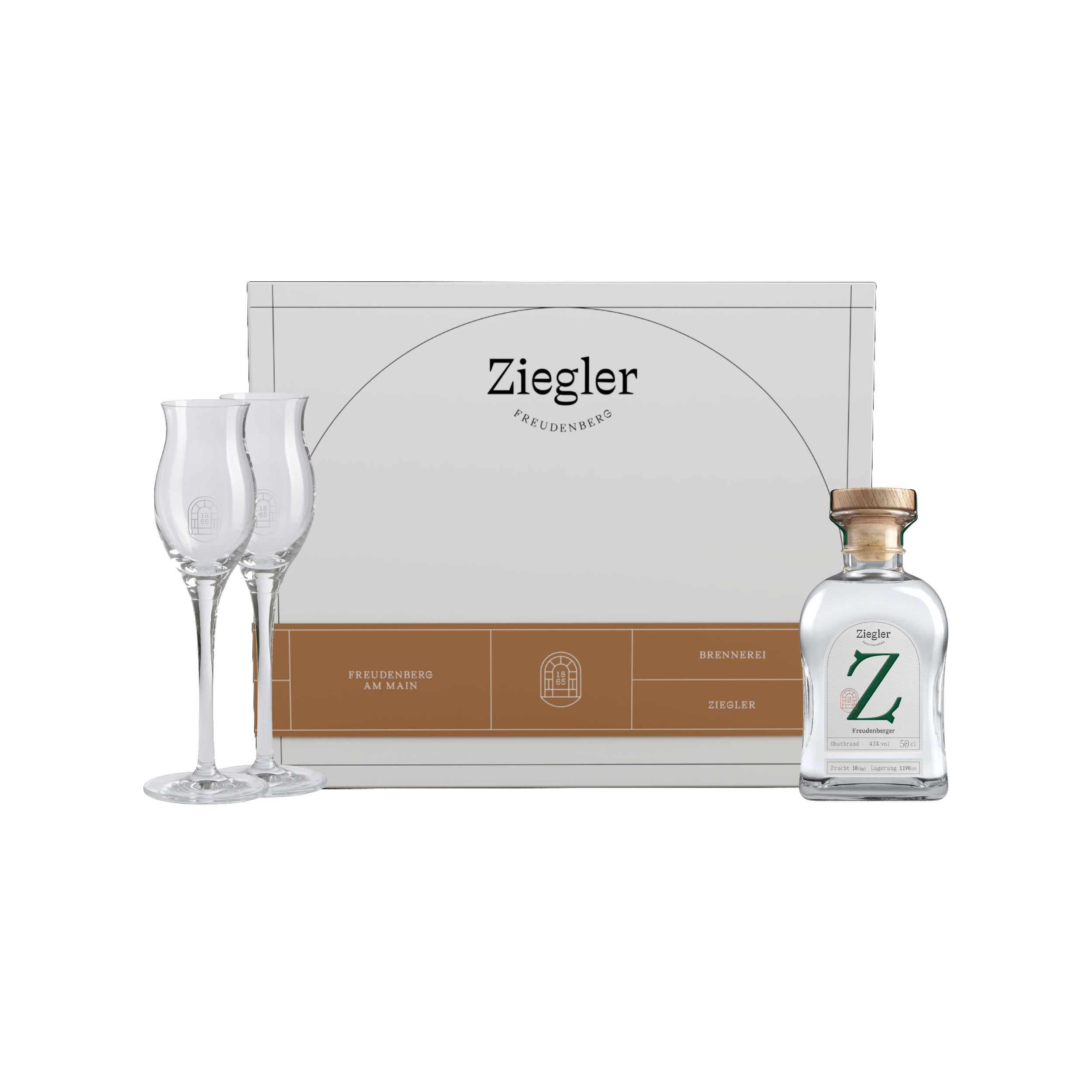 Experience the art of distillation at its finest: the Freudenberger fruit brandy made of apples and pears, presented in an exclusive Ziegler gift box. Two refined digestif glasses in classic tulip shape enhance the development of aromas and allow the noble spirit to unfold to perfection – for a truly exceptional moment of enjoyment.
