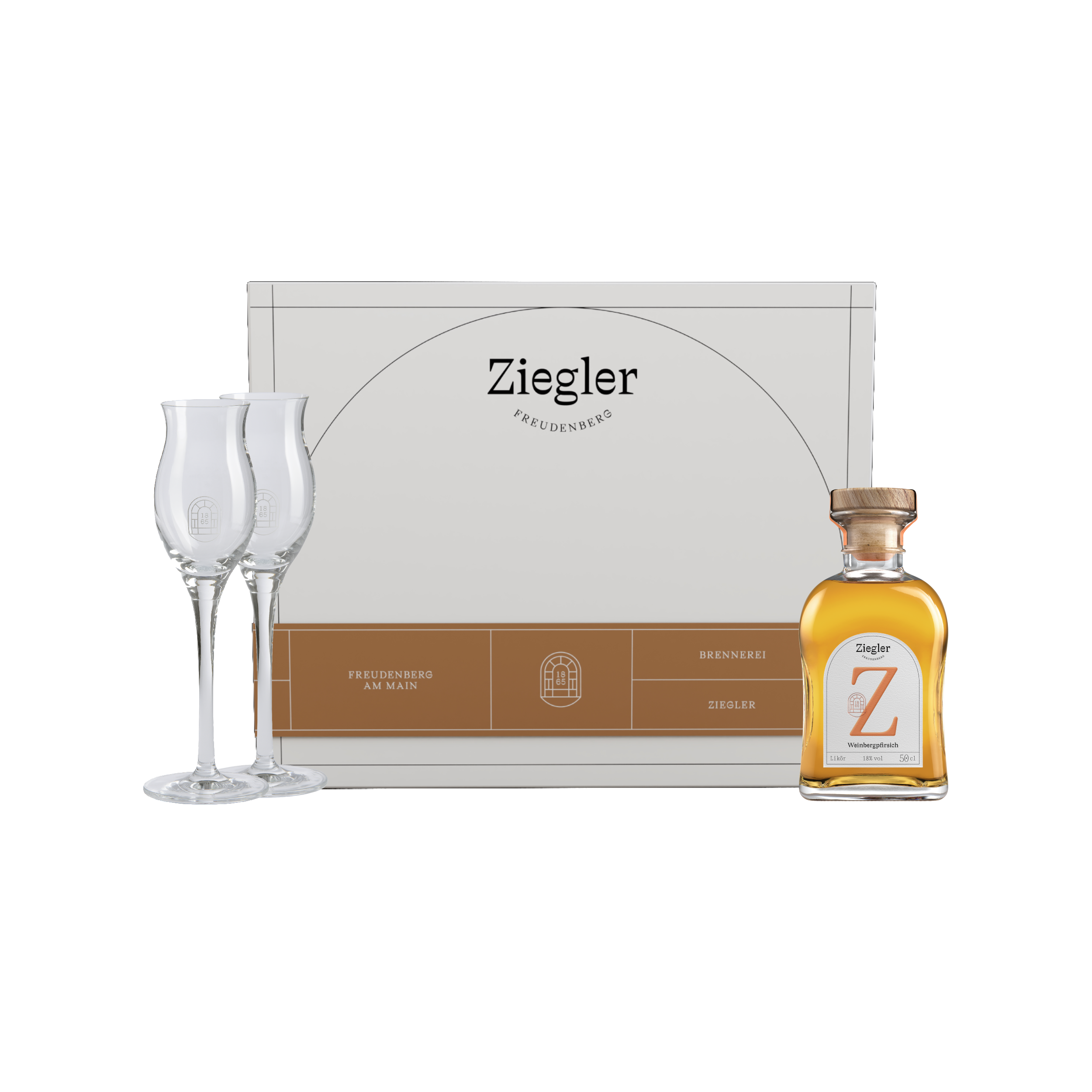 Experience the art of distillation at its finest: the vineyard peach liqueur, presented in an exclusive Ziegler gift box. Two refined digestif glasses in classic tulip shape enhance the development of aromas and allow the noble spirit to unfold to perfection – for a truly exceptional moment of enjoyment.